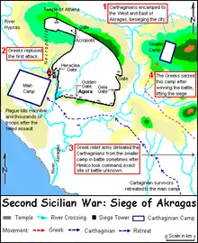 The siege of Akragas took place in 406 BCE in Sicily; the Carthaginian enterprise ultimately lasted a total of eight months. The Carthaginian army under Hannibal Mago[1] besieged the Dorian Greek city of Akragas in retaliation for the Greek raids on Punic colonies in Sicily. The city managed to repel Carthaginian attacks until a relief army from Syracuse defeated part of the besieging Carthaginian army and lifted the siege of the city.
