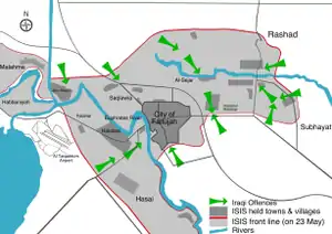 On 3 May, the Iraqi Army and allied militia forces launched an offensive in the southern Fallujah area, capturing the areas between Amiriyah and Fallujah city.[53] By the next day, Iraqi Government forces had come within 3 kilometers of Fallujah's southern entrance, capturing 4 villages, killing 100 ISIL militants, and destroying 10 ISIL tunnels.[17][54] On 5 May, Anbar Operations Commander Major General Ismail Mahlawi told Anadolu Agency that the Iraqi army had captured five areas of the city.[55]