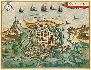 In 1600 the Dutch and English Army under the command of Maurice of Nassau and Francis Vere respectively used Ostend as a base to invade Flanders, in an attempt to conquer the city of Dunkirk after their victory in the Battle of Nieuwpoort.[32] This never happened however as disputes in the Dutch command meant that taking Spanish-occupied cities in the rest of the Netherlands took over priority as the opportunity arose.[33] Maurice concurred and had his forces evacuated by sea leaving Ostend to be preoccupied by the Spanish.[12]