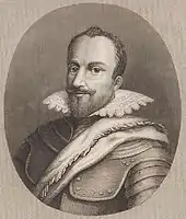 Casualties from the assault were enormous; between 1,500 and 2,000 soldiers were killed, wounded, drowned, or captured,[71] which at the time represented at least a quarter of the whole besieging army.[69] Many noblemen, chiefs, and commanders were killed or missing; the extremely wealthy Italian Count d'Imbero was slain by an English private soldier of Fairfax's company; so too was Don Durango Maistro del Campo, also known as Colonel Don Alvarez Suarez (Knight of the Order of Santiago), the hostage during the parley Colonel Simon Antonio and the Lieutenant Governor of Antwerp.[72][73] The loss of the garrison was forty killed and 100 wounded;[59] Horace Vere was wounded in the leg with a splinter while two captains and four other officers were killed.[68][70]