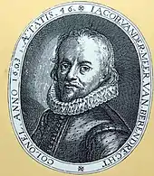 Queen Elizabeth I died in March 1603, and the subsequent succession of James I led to diplomatic talks.[82] Both the ambassadors of Spain, Juan de Acuña Tassis and Juan Fernández de Velasco, congratulated the new monarch but also hoped to seek truces and mutual good faith.[83] James at the same time discouraged the levy of English soldiers to help defend Ostend and declared a ceasefire at sea, in an effort to start peace talks with Spain. The ascension of James I to power effectively ended the Anglo-Spanish war, but this didn't deter English soldiers fighting for the United Provinces.[84] John Ogle, who had been knighted at Woodstock in 1603, continued to recruit English troops to send to Flanders. He would later become the commander of the English forces at Ostend the same year.[85] Meanwhile, Johan van Oldenbarnevelt, heading the delegation of the States, tried to attract the complicity of the new English monarch in the conflict in Flanders, of which the focus was Ostend.[75]