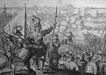Ostend was resupplied via the sea and as a result held out for three years.[11] A garrison did a tour of duty before being replaced by fresh troops, normally 3,000 at a time keeping casualties and disease to a minimum.[12] The siege consisted of a number of assaults by the Spanish, including a massive unsuccessful assault by 10,000 Spanish infantry in January 1602 when governed by Vere.[13] After suffering heavy losses the Spanish had replaced the Archduke with Ambrosio Spinola and the siege settled down to one of attrition with the strong points gradually being taken one at a time.[4]
