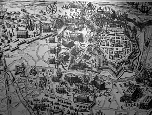 The reason why Parma was so cautious to attack was not just for its defences, but also its place right near the sea.[12][37] The old church and town faced the seas, but in 1583 the new town, further inland, was fortified with ramparts, counterscarps, and two broad ditches.[24] The dunes were cut away, and the sea was allowed to fill the ditches and surround the town.[14] A canal called the Geule had begun to form a new harbour on the east side; it was wide, deep, and navigable and served the maritime traffic to the city.[11] To the south a framework of often flooded streams and wetlands would have made the area difficult to place heavy siege guns.[12] Where the land rose slightly towards the dunes, on either side of the town; the besiegers would be able to approach with their parallels and batteries and as such were vulnerable points.[37]