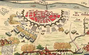 Kościuszko was able to gain some time to finish preparation for the upcoming siege, dividing his forces into the field army (23,000), garrison (3,000) and city militia (18,000).[2] Another estimate gave him 35,000 men and 200 guns.[1] The field army had a line of field fortifications and trenches prepared outside the main city walls and fortifications.[2]