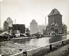 On 19 January, a fire broke out in the melt-pot room, and efforts to put it out were under way when approximately 50 long tons (50 t) of TNT ignited at 6:52 pm. The TNT plant was destroyed instantly, as were many nearby buildings, including the Silvertown Fire Station. Much of the TNT was in railway goods wagons awaiting transport.[4] Debris was strewn for miles around, with red-hot chunks of rubble causing fires. A gasometer gasholder was damaged on Greenwich Peninsula, creating a fireball from 200,000 cubic metres (7,100,000 cu ft) of gas; the holder was later repaired and remained until 1986. Several thousand pounds' worth of goods were also destroyed in nearby warehouses, estimated by the Port of London Authority to span 7 hectares (17 acres).[5] The chancel and church hall of the local church, St Barnabas', were destroyed, only to be replaced in 1926.[6]