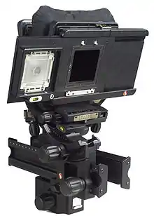 New concept camera that renews the characteristics of the SLV, using most of its accessories, has the shiftable viewfinder embodied which coupled to the shift movement gives operative easiness and simplicity of use. The lens-format frames are interchangeable, starting from the Schneider series the including the Rodenstock one too. The camera is now out of production.