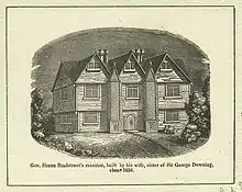 After a brief stay in Boston, Bradstreet made his first residence in Newtowne (later renamed Cambridge), near the Dudleys in what is now Harvard Square.[12] In 1637, during the Antinomian Controversy, he was one of the magistrates that sat at the trial of Anne Hutchinson, and voted for her banishment from the colony.[13] In 1639 he was granted land in Salem, near that of John Endecott. He lived there for a time, moving in 1634 to Ipswich[14] before becoming one of the founding settlers of Andover in 1648.[10] In 1666 his Andover home was destroyed by fire, supposedly because of "the carelessness of the maid".[15] He had varied business interests, speculating in land, and investing with other colonists in a ship involved in the coasting trade.[15] In 1660 he purchased shares in the Atherton Company, a land development company with interests in the "Narragansett Country" (present-day southern Rhode Island). He became one of its leading figures, serving on the management committee, and publishing handbills advertising its lands.[16] When he died he owned more than 1,500 acres (610 ha) of land in five communities spread across the colony.[17] He was known to own two slaves, a woman named Hannah and her daughter Billah.[18]