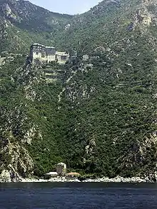The hagiography tells that Simon was a hermit living in a cave on Mount Athos near the rock now known as Simonopetra, or Simon's Rock. In a dream, the Theotokos called on him to build a monastery on the rock, promising to protect it and to look after him and the monastery. Another version is that one night he saw a star so bright that he identified it with the Star of Bethlehem. Watching it over several nights, he saw it stay motionless, at first thinking it was a demonic temptation, but on Christmas Eve the star stood over a high rock and a voice said "Here, Simon, you must lay the foundations of your monastery for the salvation of souls." So he built the monastery and gave it the name of New Bethlehem (Greek: Νέα Βηθλεέμ).[2] It remains dedicated to the Nativity of Jesus.