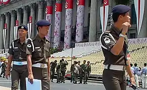 Officers exercise leadership and command authority in the SAF. Prospective officers are selected from trainees in BMT and SCS, and undergo training at the Officer Cadet School (OCS).[8] While training to become an officer, they hold the rank of officer cadet or midshipman, which are considered equivalent in rank to a private.[7] Prospective officers are required to hold GCE Advanced Level, polytechnic diploma, international baccalaureate or equivalent tertiary qualifications, and career officers are encouraged to obtain higher studies in universities. They are appointed by the President of Singapore.[16]
