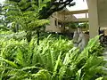 The corridors and walkways of the Botany Centre are covered by leaf imprints. There are also a number of wooden carvings scattered around the grounds and fern-covered vertical walls.