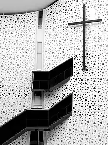 The façade is made up of three sections of perforated panels which are “sewn” together by black external staircases which culminate in a large Cross.[6]