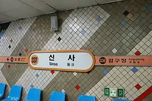 ![]() The station sign of Sinsa station in 2017 | |||||||||||