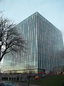The Sir Duncan Rice Library is the main academic library for the University of Aberdeen. It was designed by Schmidt Hammer Lassen Architects and completed in 2011. It is named after Duncan Rice, a previous Principal of the university. The cube-shaped building can be seen prominently from the entire campus and much of the city. It is a seven-storey tower, clad in zebra-like jagged stripes of white and clear glass. The building has a floorspace of 15,500 square metres. It houses several of the University's historic collections, including more than a quarter of a million ancient and priceless books and manuscripts that have been collected over five centuries since the University's foundation. There is also public exhibition space. The library replaced the smaller Queen Mother Library as the university's main library.