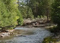 Whychus Creek is a perennial stream with headwaters in the Three Sisters Wilderness area.[9] The creek flows southwest to northeast through the park. On the west side, the creek divides the two municipal parks. It then flows under the highway and through Sisters State Park, exiting park property on the north side boundary. The land throughout the park area is generally flat with a gentle down-hill slope toward Whychus Creek.[1][2]