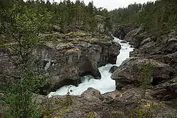 South of the village Randsverk it flows through Ridderspranget—a ravine named after a Norwegian myth.