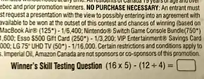 The most common form that these questions take is as an arithmetic exercise. A court decision ruled that a mathematical STQ must contain at least three operations to actually be a test of skill. For example, a sample question is "(2 × 4) + (10 × 3)" (Answer: 38). The winner should not receive any assistance (e.g. using a calculator, asking another individual to calculate the answer for the winner) in answering the STQ. Enforcement of these rules is not very stringent, especially for small prizes. Enforcement is often impossible if the winner chooses the time and location to answer the question (for example, the question is attached to the prize claim form). In most cases, there is no individual monitoring to ensure the integrity of answering STQ without assistance and the winner will submit the claim form having affirmed that they completed STQ without any assistance. In some cases, the player may not be required to answer the STQ to claim a prize. The questions are also becoming easier.[1] For contests held in other countries but open to Canadians, a STQ must be asked of any potential Canadian winner.