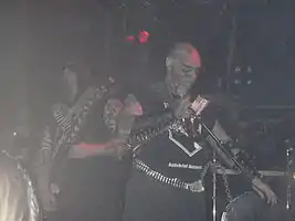 Among some skinheads, heavy metal is popular. Bands such as the Canadian act Blasphemy, whose guitarist is black, has been known to popularise and merchandise the phrase "black metal skinheads".[29] As the group's vocalist recounts, "a lot of black metal skinheads from the other side of Canada" would join in on the British Columbian black metal underground. "I remember one guy... who had 'Black Metal Skins' tattooed on his forehead. We didn't hang out with white power skinheads, but there were some Oi skinheads who wanted to hang out with us."[44] National Socialist black metal has an audience among white power skinheads. There was a record label called "Satanic Skinhead Propaganda" that was known to specialize in neo-Nazi black metal and death metal bands.[45] Black metal pioneer and right-wing extremist Varg Vikernes was known to adopt a skinhead look and wear a belt with the SS insignia while serving time in prison for the arson of several stave churches and the murder of Øystein Aarseth.[46]