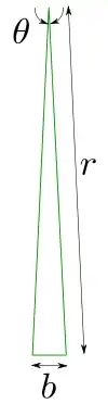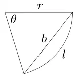 This result is equivalent to assuming that the length of the base of the triangle is equal to the length of the arc of circle of radius r subtended by angle θ. The error is 10% or less for angles less than about 43°,[2][3] and improves quadratically: when the angle decreases by a factor of k, the error decreases by k2.