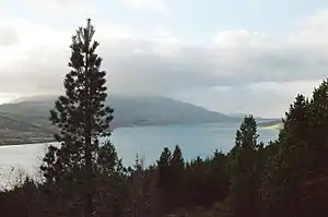 The lake is also a reservoir so that the level of the water surface has been raised.