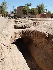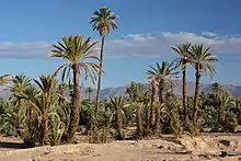 Many of these rivers remain dry outside the spring period, which has required a careful and elaborate system of irrigation and water preservation within the oasis. This system draws from both surface waters and subterranean waters. A series of khettaras (a type of underground canal) draws subterranean waters from the phreatic table in the higher-elevation regions of the mountain foothills and brings them to reservoirs in the oasis. At the same time, a series of dams along the main rivers allows for some of the surface waters to be diverted as well. From these reservoirs water is then distributed via a network of irrigation canals (seguias) to the various agricultural plots. This water supply system was collectively shared and maintained by the entire population of the oasis, with landowners agreeing to take turns to receive water for their crops. Alongside the palms a variety of common crops were grown such as dates, other fruit trees, vegetables, and cereals.[1][2]