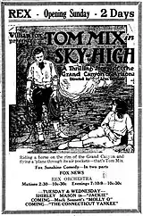 Sky High is a 1922 American silent Western film written and directed by Lynn Reynolds and starring Tom Mix, J. Farrell MacDonald, Eva Novak and Sid Jordan. The action in Sky High takes place in 1922 and while the characters ride horses and fight in saloons, they also use telephones, automobiles and even an aircraft.[1] In 1998, the film was selected for preservation in the United States National Film Registry by the Library of Congress as being "culturally, historically, or aesthetically significant".