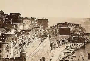 From 1804 to 1819, the prison was used as a temporary naval hospital with 50 beds.[5][13] After the 1806 Birgu polverista explosion, the government provided part of the prison as a store to the wine merchant Mr. Woodhouse, who had lost large quantities of wine in the disaster.[14] In 1824 part of the building was demolished, to make way for a planned protestant church which did not materialise, only to later be rebuilt.[1] Later on in the 19th century, the building housed an elementary school, which was known as l-iskola tal-ħabs (school of the prison). It eventually became an examination hall before being closed down in 1940.[15] The building was included on the Antiquities List of 1925.[16] The prison was bombed in World War II,[17] and the ruins were subsequently demolished.[7] A large block of flats was built on its site in the 1950s.[12]