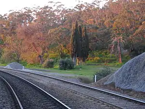 From 1909, a branch line, parallel to the main line and the Clapham branch line, served the Sleeps Hill quarries. The branch became the second main line in 1915, and the quarries were worked by a backshunt from Eden Hills. For a short time, from 1916, Sleeps Hill was the Southern limit of SAR suburban train workings, until the double track passed through the new tunnels to Eden Hills. The station was relocated to the south of the quarry sidings in the 1940s[1] and removed when Lynton station was opened in the mid-1950s.[2] Some of the foundations of the station buildings, the trees from the station gardens, some of the foundations of the quarry crushing plant, and evidence of the alignment of the spur lines and sidings are all that remain.