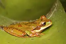 The New Granada cross-banded tree frog (Smilisca phaeota, also known as the masked tree frog) is a species of frog in the family Hylidae found in Colombia, Costa Rica, Ecuador, Honduras, Nicaragua, and Panama. Its natural habitats are subtropical or tropical dry forest, subtropical or tropical moist lowland forest, rivers, freshwater marshes, intermittent freshwater marshes, plantations, rural gardens, urban areas, heavily degraded former forests, ponds, and canals and ditches.