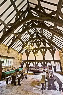 The hall has three ranges around an open court. The oldest part of the structure is the great hall in the north range which was probably built in the early-14th century and once was surrounded by a moat. It has been altered but retains its original plan and medieval features.[3] The oldest parts were built with timber frames and the oldest stonework is roughly coursed rubblestone. The 19th-century west wing is built in coursed, squared stone and has decorative timber framing. All the roofs are covered in stone flags.[2]
