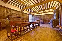 The name Smithills derives from the Old English smeþe meaning smooth and hyll, a hill and was recorded as Smythell in 1322.[4] Early medieval records about the hall began in 1335 when William Radcliffe acquired the manor from the Hultons who held it from the Knights Hospitaller. On Radcliffe's death in 1369 it passed to his son and heir Sir Ralph Radcliffe, High Sheriff of Lancashire for 1384–1387 and twice MP for Lancashire. The Radciffes lived there until 1485, when the male line failed and Smithills Hall passed to the Bartons, wealthy sheep farmers who lived there for nearly 200 years.