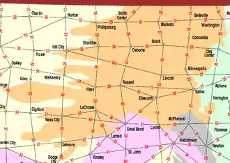 The Smoky Hills region is part of the Plains Border subregion of the Great Plains.[1] It occupies nearly all of north-central Kansas, bordered on the west by the High Plains, on the northeast by the Dissected Till Plains, on the east by the Flint Hills, and on the south by the Arkansas River lowlands.[2] The region extends into south-central Nebraska, bordered on the north by the Rainwater Basin.[3]