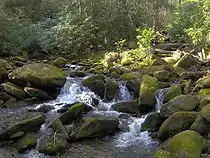 The Snake Den Ridge Trail crosses Inadu Creek immediately upstream from a small waterfall. The creek's streambed, like most streams on the slopes of the Smokies, is filled with boulders. From Inadu Creek, the trail follows a steep incline northward to the crest of the ridge, where it turns westward again to ascend along the ridgecrest. The trail follows a series of inclines and switchbacks as it winds its way across the top of the ridge. Views through the treeline of Cocke County to the north alternate with views of Camel Hump Ridge and the main Smokies crest to the south as the trail switches back and forth across the ridgeline.