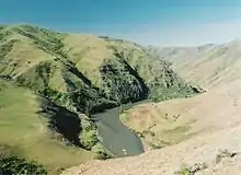 The river's flow is also measured at several other points in its course. Above Jackson Lake, Wyoming, the discharge is about 885 cu ft/s (25.1 m3/s) from a drainage area of 486 square miles (1,260 km2).[48] At Minidoka, Idaho, about halfway through the Snake River Plain, the river's discharge rises to 7,841 cu ft/s (222.0 m3/s).[49] However, at Buhl, Idaho, only about 50 miles (80 km) downstream, the river's flow decreases to 4,908 cu ft/s (139.0 m3/s) because of agricultural diversions and seepage.[50] But at the border of Idaho and Oregon, near Weiser at the beginning of Hells Canyon, the Snake's flow rises to 17,780 cu ft/s (503 m3/s) after receiving several major tributaries such as the Payette, Owyhee and Malheur.[51] The discharge further increases to 19,530 cu ft/s (553 m3/s) at Hells Canyon Dam on the border of Idaho and Oregon.[52] At Anatone, Washington, downstream of the confluence with the Salmon, one of the Snake's largest tributaries, the mean discharge is 34,560 cu ft/s (979 m3/s).[53]
