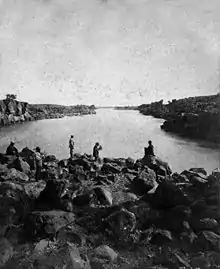By the middle 19th century, the Oregon Trail had been established, generally following much of the Snake River. One crossing the trail made over the Snake River was near the present-day site of Glenns Ferry. Several years later, a ferry was established at the site, replacing the old system where pioneers had to ford the wide, powerful and deep Snake. Another place where pioneers crossed the Snake was further upstream, at a place called "Three Island Crossing", near the mouth of the Boise River. This area has a group of three islands (hence the name) that splits the Snake into four channels each about 200 feet (61 m) wide. Some emigrants chose to ford the Snake and proceed down the west side and recross the river near Fort Boise into Hells Canyon, continue down the drier east side into the gorge, or float the Snake and Columbia to the Willamette River, the destination of the Oregon Trail. The reason for the Three Island Crossing was the better availability of grass and water access.[71] Numerous ferries have provided crossings of the upper Snake from the Brownlee Ferry at the head of Hell's Canyon[72] to Menor's Ferry,[73] which operates today at Moose, Wyoming. Sophistication varied from reed boats pulled by Indians on horse back at Snake Fort, Fort Boise, as described by Narcissa Whitman[74] in 1836 to an electric operated ferry, the Swan Falls Ferry,[75] at Swan Falls Dam of the early 20th century.