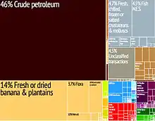 The economy of Ecuador is the eighth largest in Latin America and the 69th largest in the world by total GDP.[19] Ecuador's economy is based on the export of oil, bananas, shrimp, gold, other primary agricultural products and money transfers from Ecuadorian emigrants employed abroad.[20] In 2017, remittances constituted 2.7% of country's GDP.[21] The total trade amounted to 98% of the Ecuador's GDP in 2017.[22]