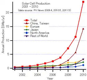 Solar PV is growing fastest in Asia, with China and Japan currently accounting for half of worldwide deployment.[34] Global installed PV capacity reached at least 301 gigawatts in 2016, and grew to supply 1.3% of global power by 2016.[35]