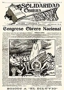 Throughout its history, Solidaridad Obrera has had troubles with the authorities. Publication was suspended on 30 November 1907, but resumed the following February. In 1918, following a major recruitment drive by the CNT, the government shut down publication for a brief period.[4] In 1919, publication was moved to Valencia from Barcelona, though it was moved back to Barcelona in 1923, only to be banned the following year by Prime Minister Miguel Primo de Rivera. After de Rivera stepped down, the Second Spanish Republic was founded, and the paper resumed publication on 31 August 1930 with economic help from anarchists of Manresa, Spain, and their own printing press. At this time the paper was being edited by Joan Peiró, and had a press-run of 26,000 copies. In September 1931, the paper took a new direction when it was taken over by members of the FAI,[5] after a confrontation between more moderate treintistas and the anarchists of the FAI, going through seven editors in a matter of fourteen months.
