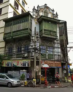 Most of them considered as the early row buildings in Bangkok along the Chao Phraya river, there's beautiful three-story building decorated with stucco. On the opposite side are two-story buildings which are also beautifully decorated with stucco in flower, fruit motif and Corinthian pillars over the window frame, is the arches decorated with the colour glasses. Including the walls of some buildings in the middle phase of the road, there're also graffiti artwork from Western artists. In addition, Song Soem road (ถนนทรงเสริม), which is a separate road from Song Wat. It is considered to be the shortest road in Thailand. It is only 20 m (about 65 ft) long, ending at the pier on Chao Phraya river. The opposite side are Lhong 1919 and Wanglee House, which Lhong 1919 is an old port warehouse built with traditional Chinese architecture of the Wanglee family, including the location of the Mazu Joss House. It has been renovated to become a new tourist attraction includes a new landmark of Khlong San area in Thonburi.[4][5]