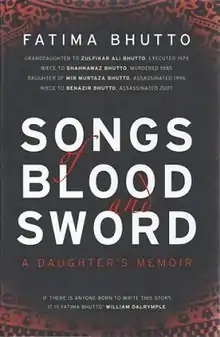 Songs of Blood and Sword is a memoir written by Fatima Bhutto. The book recounts author's father, Murtaza Bhutto's murder by the Pakistani police in Karachi in 1996, when she was a teenager of 14 years old. The story covers the events, she saw through her eyes in her young lifetime.[1]