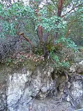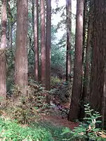 The most readily accessed eastern slopes have a predominant occurrence of Goulding clay loam soils, particularly in the immediate area of Graham Creek.[3] These are generally areas of 15 to 30 percent slopes that support dense mixed oak woodland, with large percentages of California laurel and bigleaf maple. Higher on the eastern slopes is a large occurrence of Goulding clay loam on 30 to 50 percent slope, still with a dense forest cover, but with more Pacific madrone and coast live oak. Soil depths are rarely over a few feet deep before bedrock is reached, but even thin soils support rich plant growth because of the high nutrient content and mild climate.