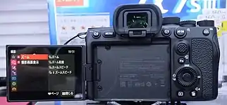 The α7S III has a TFT LCD screen with a size of 7.5 cm (3 inches) and resolution of 1,440,000 dots (800 x 600 pixels) (SVGA) with an adjustable tilt angle of 107 degrees up and 41 degrees down (approximate). The OLED electronic viewfinder has a resolution of 9,437,184 dots (2048 x 1536 pixels) (3.15MP) (QXGA) and a .90x magnification.[8]