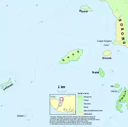 Soop, also known as Sop or Tsiof, is an island in West Papua, Indonesia, located in the north of Sele Strait, and off the northwestern coast of the Bird's Head Peninsula. It lies at a distance of about 4 kilometres (2.5 mi) west of the city of Sorong on the mainland, 2.5 kilometres (1.6 mi) west of the island of Doom, 3 kilometres (1.9 mi) northwest of the uninhabited island of Nana, 6 kilometres (3.7 mi) north-east of the island of Yefman, and 5 kilometres (3.1 mi) south of the island of Raam. Soop is 3.3 kilometres (2.1 mi) long and up to 1.3 kilometres (0.81 mi) wide, with an area of 2.67 square kilometres (1.03 sq mi).