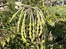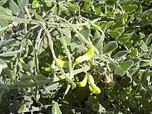 Sophora tomentosa, also known as necklacepod, yellow necklacepod,[3] and occasionally as silver bush, is a pantropical[1] shrub or small tree in the family Fabaceae. It commonly ranges in height from 4 to 10 feet and often occurs in coastal conditions and near wetlands.[4] The common name Necklacepod is derived from the characteristic string of seed pods that develop after its yellow flowers germinate into seeds.