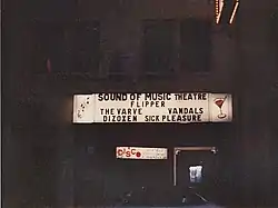 The first punk performance at Sound of Music was in February 1980, with the bands The Employees and Freon. The venue became a full-time punk club, with many new up-and-coming bands playing most days of the week. Refreshments consisted of cans of beer sold out of coolers for a dollar. A few notable bands, such as Flipper,[2] Juvenile Justice and Vicious Circle, played their first gigs at the Sound of Music. Faith No More and Frightwig performed frequently at the Sound of Music in their early days. Game Theory broke in its San Francisco-based lineup with a pseudonymous debut appearance in May 1985.[3]