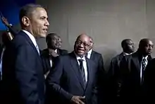 During World War I both countries fought for the Allied Powers, and U.S. President Woodrow Wilson and South African Prime Minister Jan Smuts formed a friendship at the Paris Peace Conference.[4] Initially Smuts opposed Wilson's proposal for the League of Nations, but by the beginning of the conference shifted into one of its strongest proponents.[5] In 1929, the United States and the Union of South Africa established official diplomatic relations. However, following World War II, both the United States and South Africa had political affairs that impacted their relations with all of the world. The United States had entered into the Cold War with the Soviet Union; while, simultaneously, the National Party in South Africa won the 1948 general election against its rival, the United Party. With the National Party in power, this meant that the segregationist policies that had been impacting South Africa had become lawful, and the Apartheid Era had begun. Due to this, the United States policies towards South Africa were altered; and, overall, the relationship between South Africa and the United States was strained until the end of apartheid rule. Following the Apartheid Era, the United States and South Africa have maintained bilateral relations.[6]