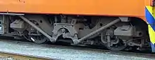 Together with the unit's electronic wheelslip detection system, these traction struts, mounted between the linkages on the bogies and the locomotive body and colloquially referred to as grasshopper legs, ensured the maximum transfer of power to the rails without causing wheel-slip by reducing the adhesion of the leading bogie and increasing that of the trailing bogie by as much as 15% upon starting off. This feature was controlled by electronic wheel-slip detection devices and an electric weight transfer relay which reduced the anchor current to the leading bogie by as much as 50A in notches 2 to 16. These grasshopper legs and linkages were to become a distinguishing feature on the bogies of most subsequent South African electric locomotive classes.[6]