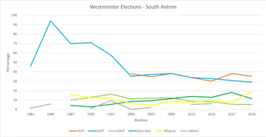 South Antrim is an overwhelmingly unionist constituency which once had the strongest vote for the Ulster Unionist Party anywhere in the province. From 1886 to 1974 the Conservative and Unionist members of the United Kingdom House of Commons formed a single Parliamentary party, and they continuously represented South Antrim