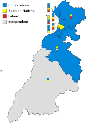 South Ayrshire Council is one of thirty-two local authority areas of Scotland. Its political structure consists of one Leader of the Council, one Deputy Leader of the Council and one Provost.[22][23] Following the 2017 Council election, the Scottish Conservative Party returned twelve councillors, the Scottish National Party returned nine councillors, Scottish Labour returned five councillors and two independent councillors were elected to the Council.[24] The Scottish Conservative and Unionist Party returned the largest number of councillors, but did not have a majority. The Scottish National Party formed a working group along with Scottish Labour and the two independent councillors to run the council after the Scottish Conservatives failed to reach a deal with Scottish Labour, who had previously supported the Conservative-led administration following the 2012 Council election.[25]
