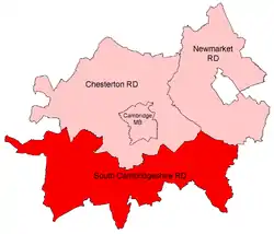South Cambridgeshire was a rural district in Cambridgeshire, England[1] established in 1934 under a County Review Order as a merger of Linton Rural District and Melbourn Rural District[2] and part of Caxton and Arrington Rural District.[3] In 1965 it became part of the new administrative county of Cambridgeshire and the Isle of Ely. It was abolished in 1974 under the Local Government Act 1972, and merged with the Chesterton Rural District to form a new South Cambridgeshire district.[4]