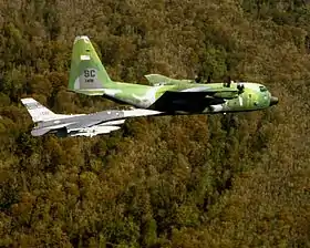 ![]() An F-16C Fighting Falcon Block 52 of the 157th Fighter Squadron flies next to a Lockheed C-130H-LM Hercules from the 169th Operations Support Flight, 169th Fighter Wing. The 157th is the oldest unit in the South Carolina Air National Guard, having over 50 years of service to the state and nation. | |